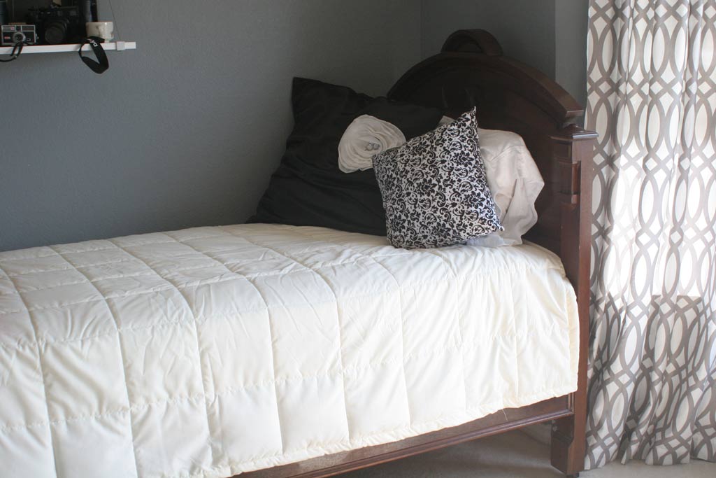 One of my favorite pieces of furniture to come from her basement is a single oak bed. It had been passed over by aunts and cousins because no one needed a fairly ornate single bed. HOWEVER, this fit my goal for the office perfectly. It is a great second guest room option (especially for when my now widowed grandmother comes down to visit with my parents) and I didn’t mind the single size.