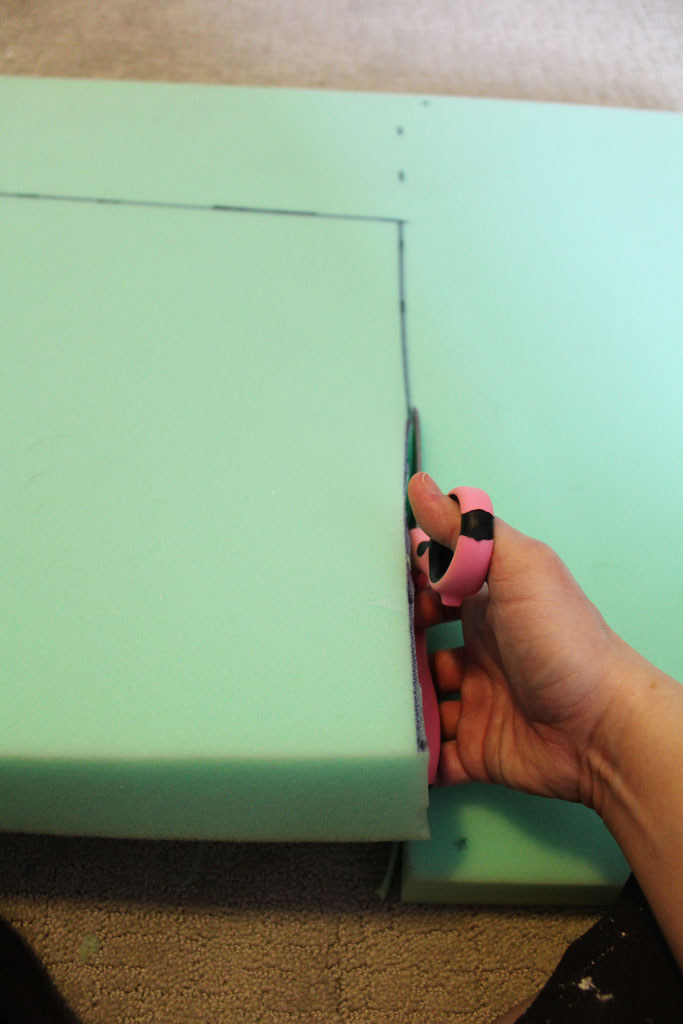 • the green 2″ Foam from JoAnn’s (purchased with a 60% off coupon because that stuff is EXPENSIVE) I needed about 1 yard, but measure your chair