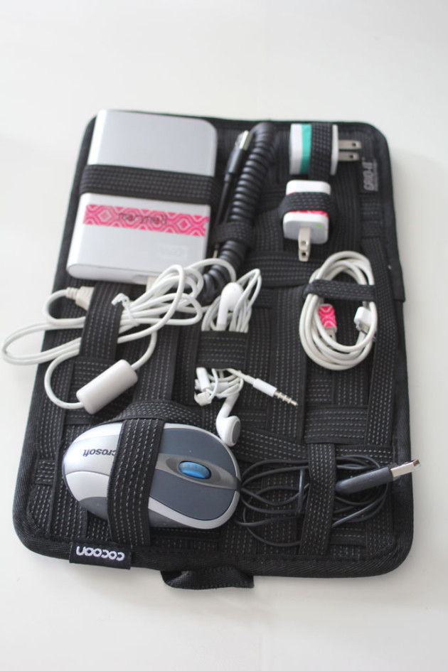 I recently spruced up my iPhone and iPad chargers with a bit of washi tape since mine have a habit of disappearing around certain members of my family. But its a great system and it slides right down into my bag making it easy to keep the cords without any of the clutter.