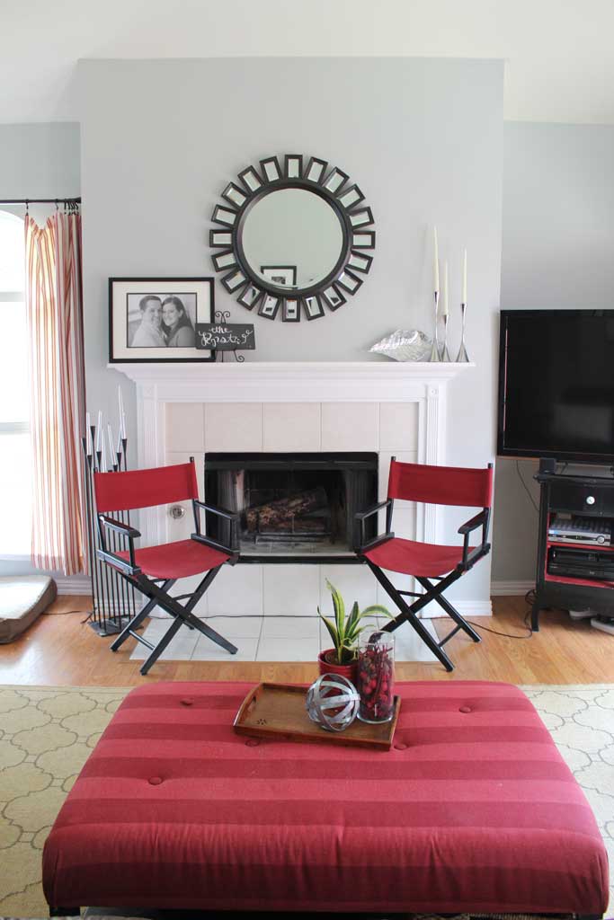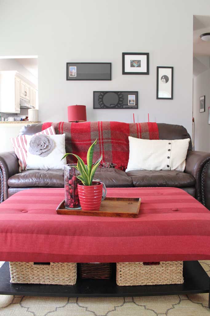 I love how comfy and cozy our family room is; this is the room we spend the most time in. Check out the ottoman that I reupholstered myself! And for more details, check out this post. But the major change came when we painted the living room a gorgeous gray color!