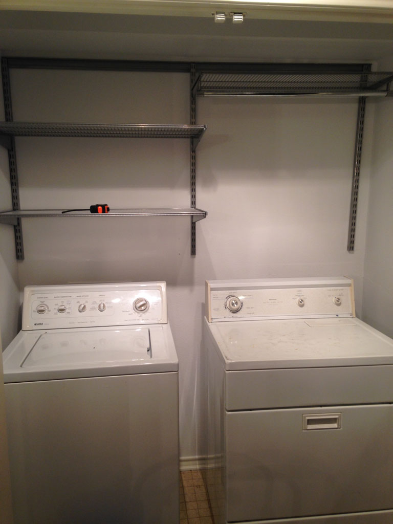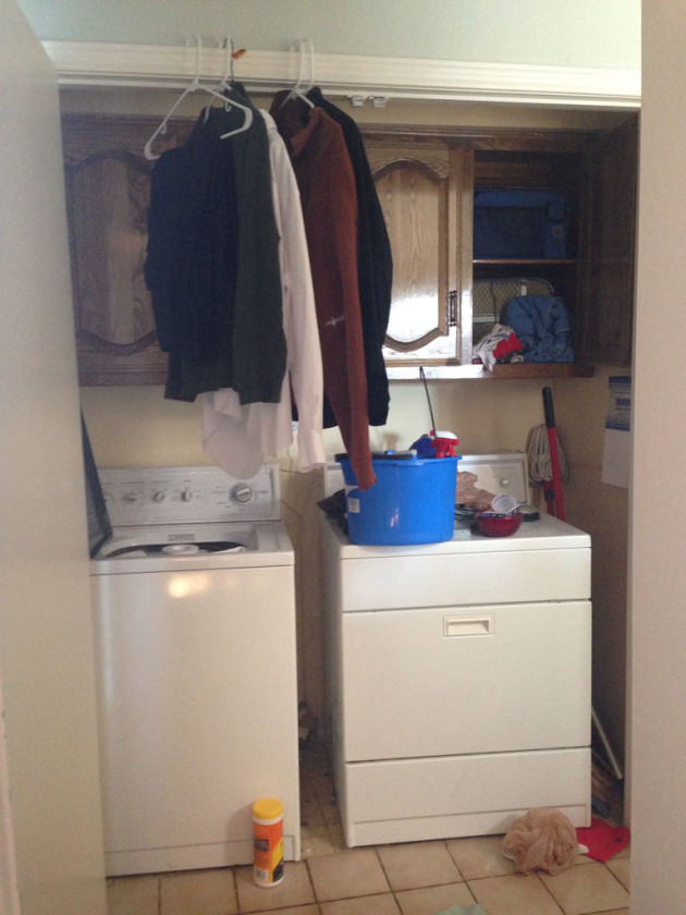 With his soon to be wife about to move in after the wedding, something needed to be done to spruce up this area! So his fiancee and I decided to tackle this as an afternoon project! Back when they bought Elfa for their closet and garage they went ahead and purchased a little extra for the laundry room. The way it was there wasn’t any space to hang clothes to dry which led to them being strewn around or hanging on the door frame.