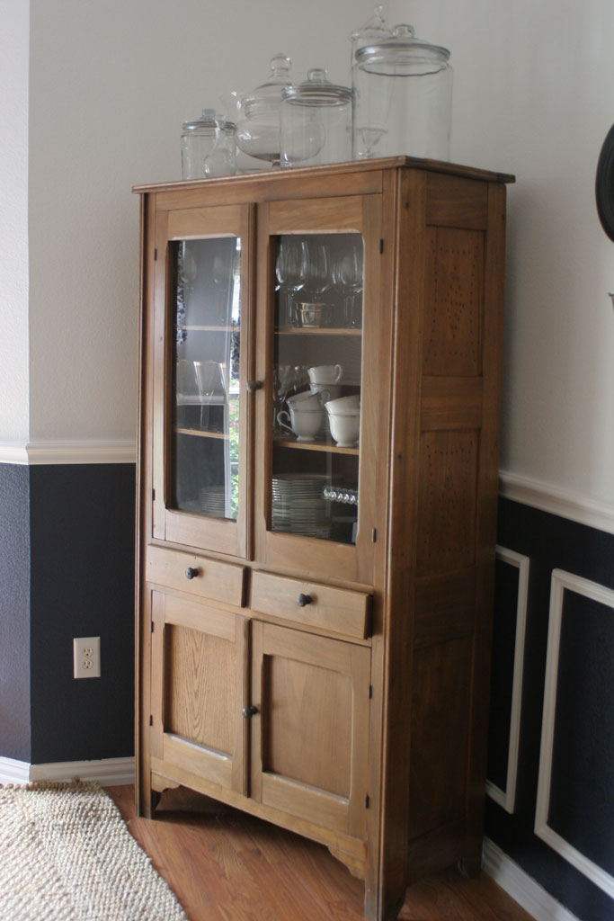I love our dining room. I love it mostly because we have already had many, many memorable nights of good friends and good food around that table. I actually nixed one of the houses I looked at because despite my realtor’s knowledge that they weren’t necessary and hardly used anymore, I knew I wanted the ability to host dinner parties. Since I didn’t have a stick of dining room furniture when I moved in, I went to my grandmother’s house and she had this large hutch she was willing to part with (it had been in the basement), as well as a dining table that had been in my grandfather’s office (the dining table actually collapses down without the leaves to make a pretty good sideboard). My grandmother bought the hutch from a neighbor when she and my grandfather returned to Kansas from WWII and paid someone to strip it down to its ‘au naturale’ state it is currently in. And can you see the holes in the sides? I’ve been told that was so you could put pies in there to cool and the holes would allow the heat to escape.