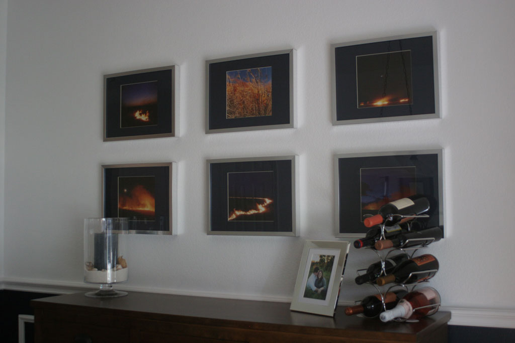 Every fall in Kansas the farmers burn some of their fields (I think to return nutrients to the ground) But they typically do it at night and it is usually a controlled burn and can be BEAUTIFUL to see. For graduation from graduate school my older brother and sister-in-law gave me a gorgeous print from a photographer who catches that process. It hangs above my mantel in the living room, but they also gave me a book with all his pictures in it, autographed by him. I loved the pictures and thought they would look beautiful framed in a collection in the dining room (don’t worry I ordered a second book instead of cutting up the autographed one). I had a friend cut navy mats to fit the pictures and hung these six in a grid on the wall. I think they look AWESOME.